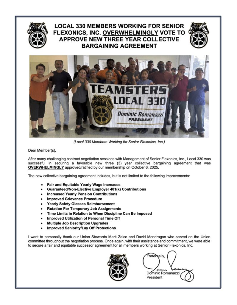 LOCAL 330 MEMBERS WORKING FOR SENIOR FLEXONICS, INC. OVERWHELMINGLY VOTE TO APPROVE NEW THREE YEAR COLLECTIVE BARGAINING AGREEMENT