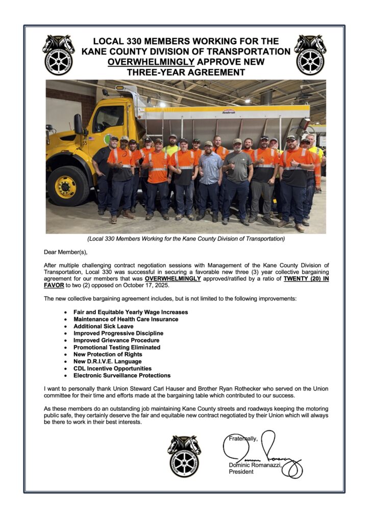 LOCAL 330 MEMBERS WORKING FOR THE KANE COUNTY DIVISION OF TRANSPORTATION OVERWHELMINGLY APPROVE NEW THREE-YEAR AGREEMENT